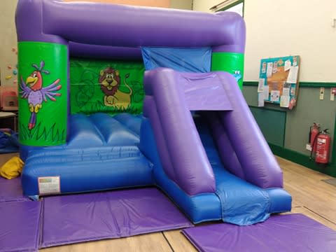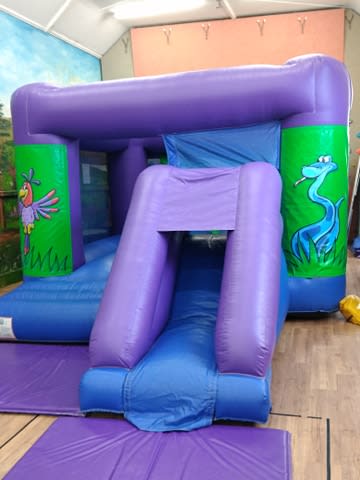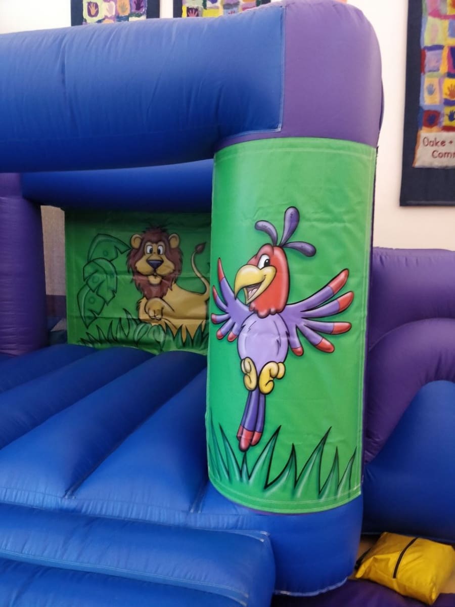 Ideal for any children's party, this inflatable bouncy castle with slide has a fully enclosed slide to add a little more entertainment to a traditional bouncy castle. Friendly jungle artwork of suitable for any age group, and occasion.